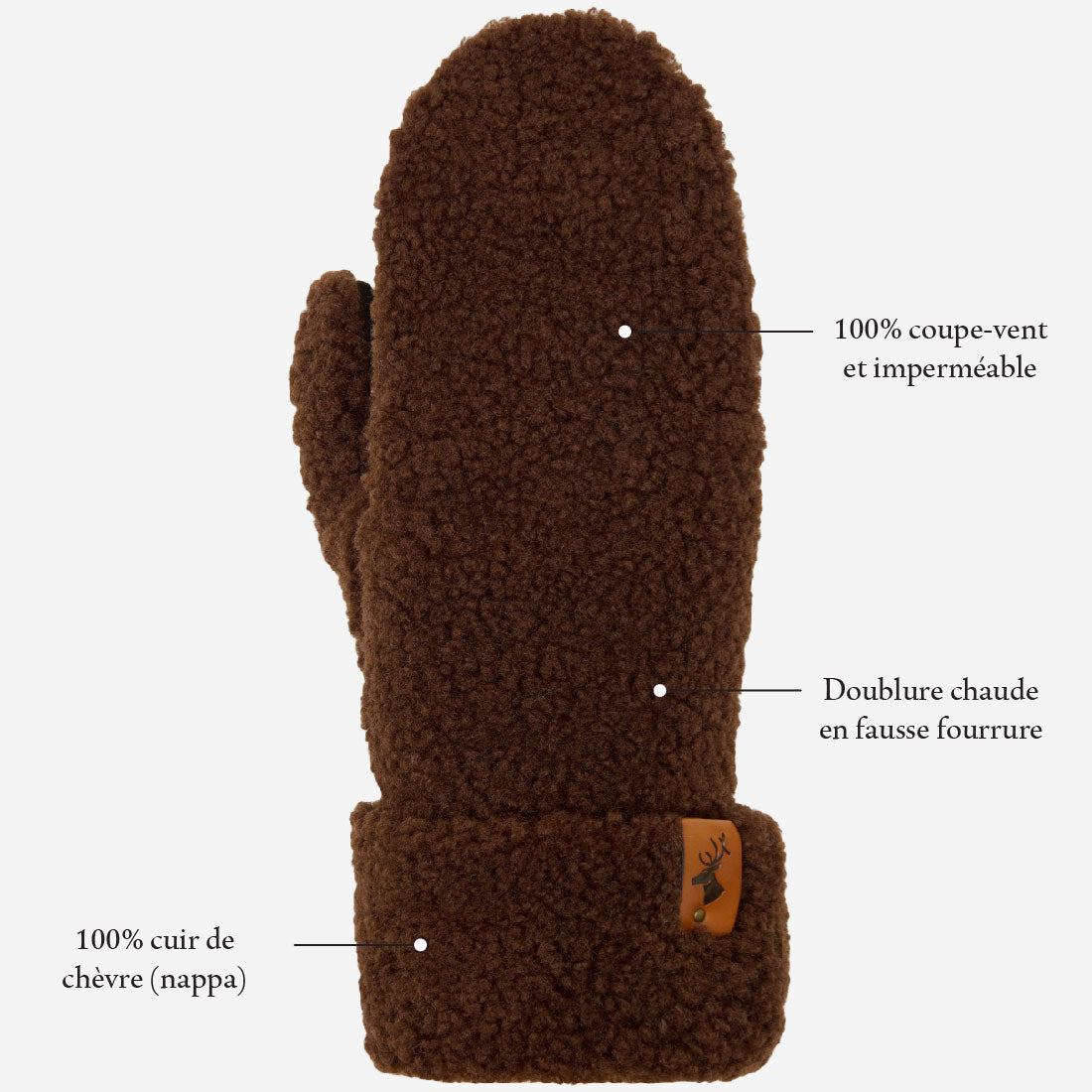 Matière : La paume des moufles est en daim luxueux en peau de chèvre Nappa et présente une fausse fourrure marron pelucheuse sur le dos.