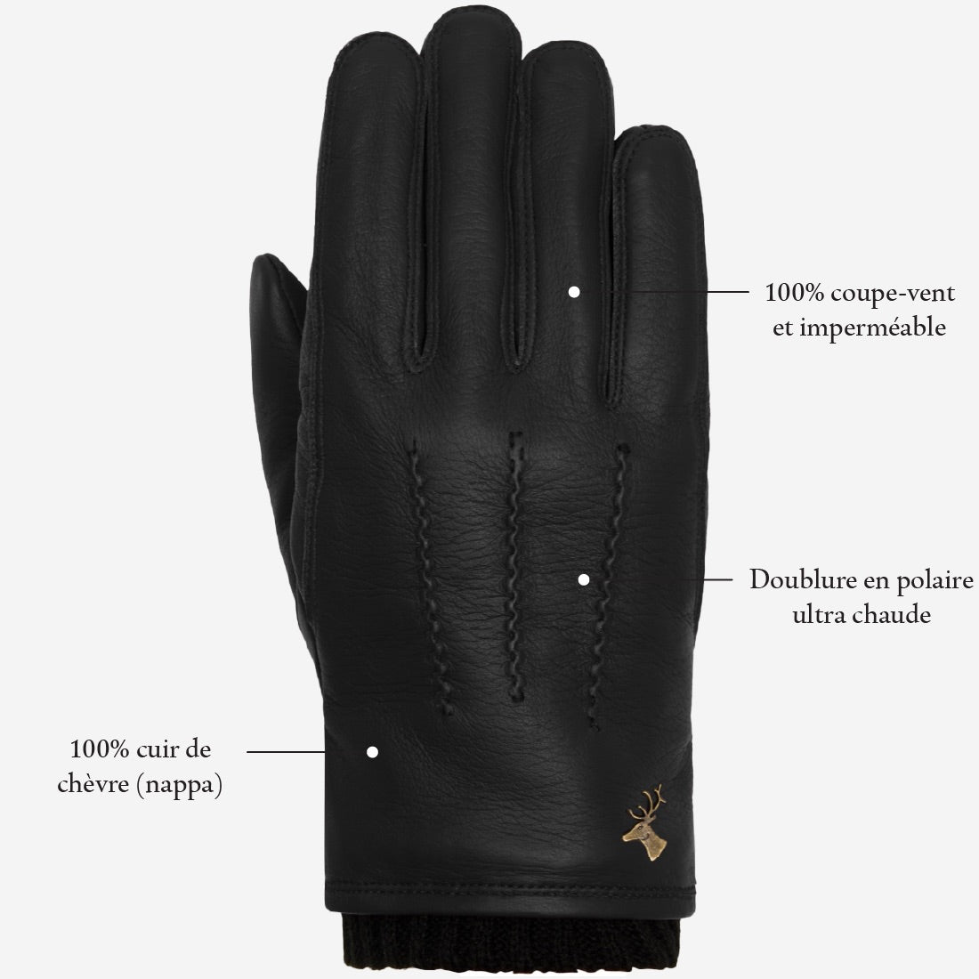 William (noir) - Gants en cuir de chèvre, doublure polaire chaude et bouton pression