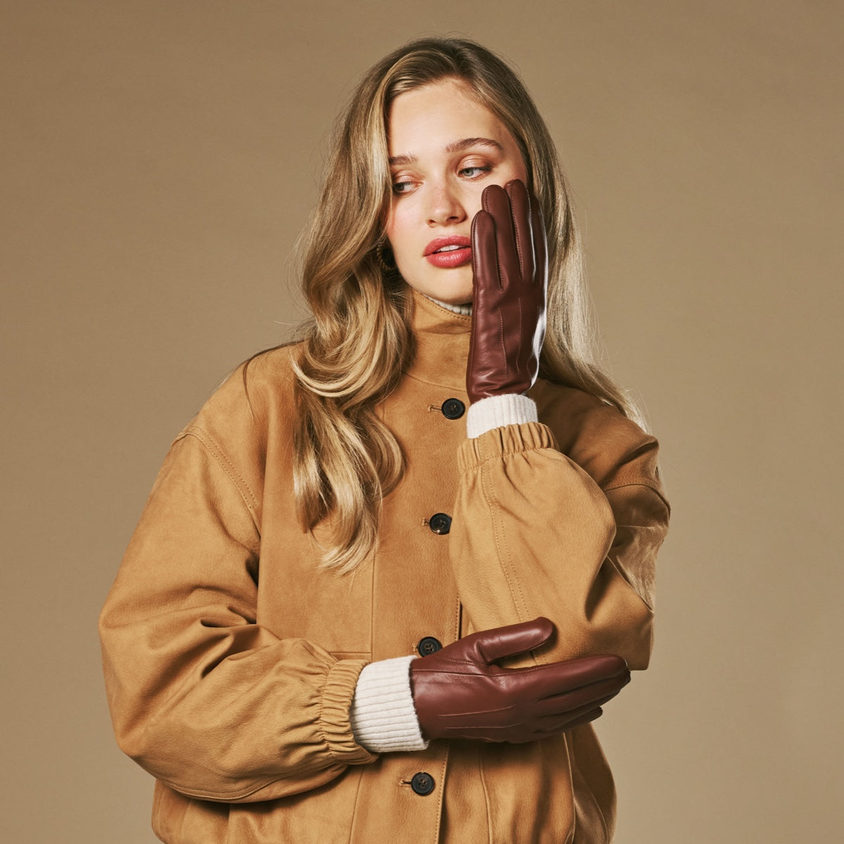 Jasmine (marron) - Gants pour femmes en cuir d'agneau doublés de fourrure de lapin luxueuse et fonction tactile.