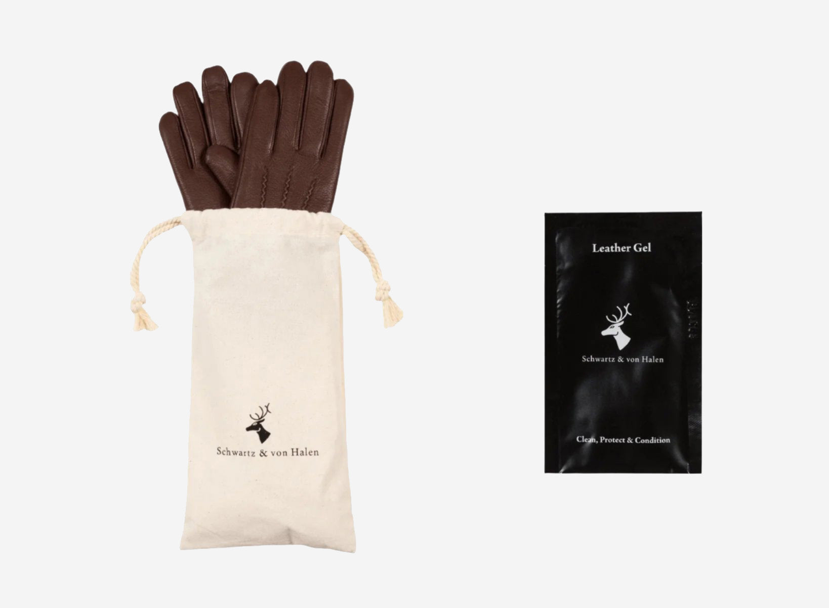 Tous les gants Schwartz & von Halen sont livrés avec une pochette en coton luxueuse et un gel de cuir spécialement conçu, ce qui en fait un cadeau idéal.